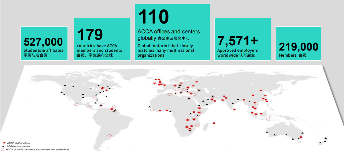 目前在全球170多个国家和地区拥有52.7万多名学员和21.9万多名会员,是国际上国际学生最多,学员规模发展最快的专业会计组织。